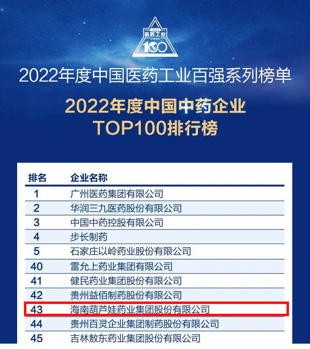 会议期间,一年一度的中国医药工业百强系列榜单隆重揭晓,981博天娱乐药业集团凭借领先的研发优势和扎实的生产实力以及稳健的市场推广能力,连续第四年成功入选“2022年度中国中药企业TOP100排行榜” ,排名稳步上升至第43位。